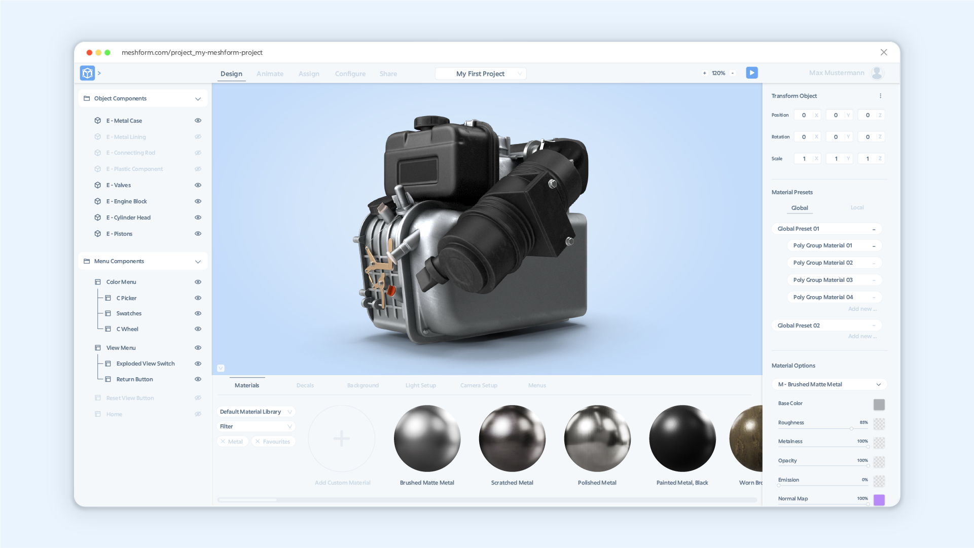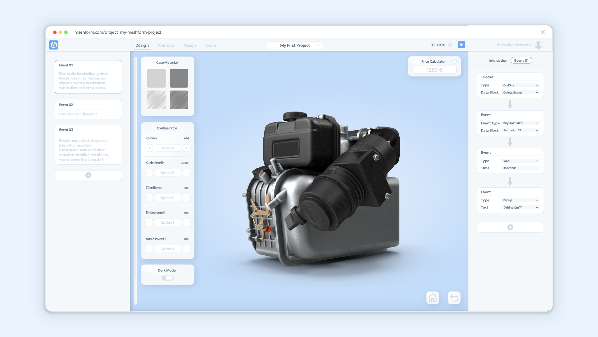 Laden Sie Ihre CAD/STEP-Dateien hoch. Meshform generiert in Sekunden interaktive Web-3D-Konfiguratoren für Ihren Vertrieb. Ohne Code. Ohne Agentur.